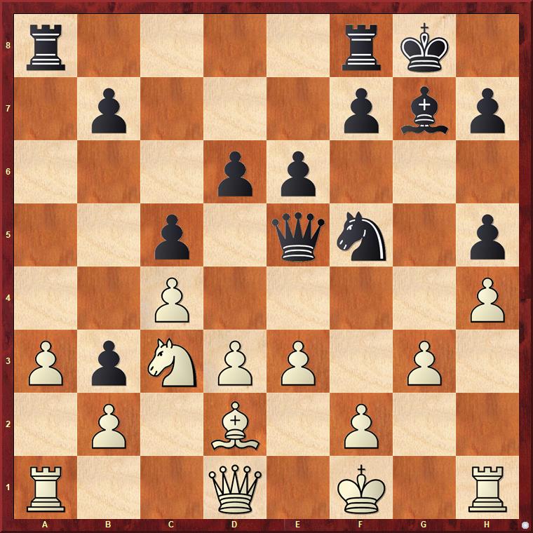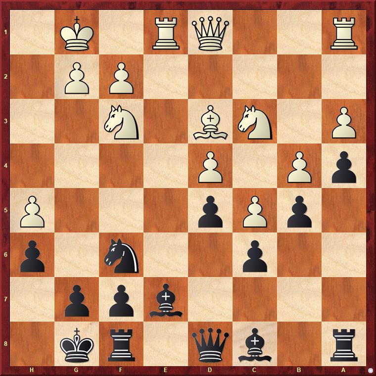 17… Bg4! This is the only move that keeps Black in the game. Black develops their bishop and prevents Ne5. However 17… Nxh5?? is a blunder. The knight on h5 is unprotected and allows 18. Ne5, which also attacks the pawn on c6.”